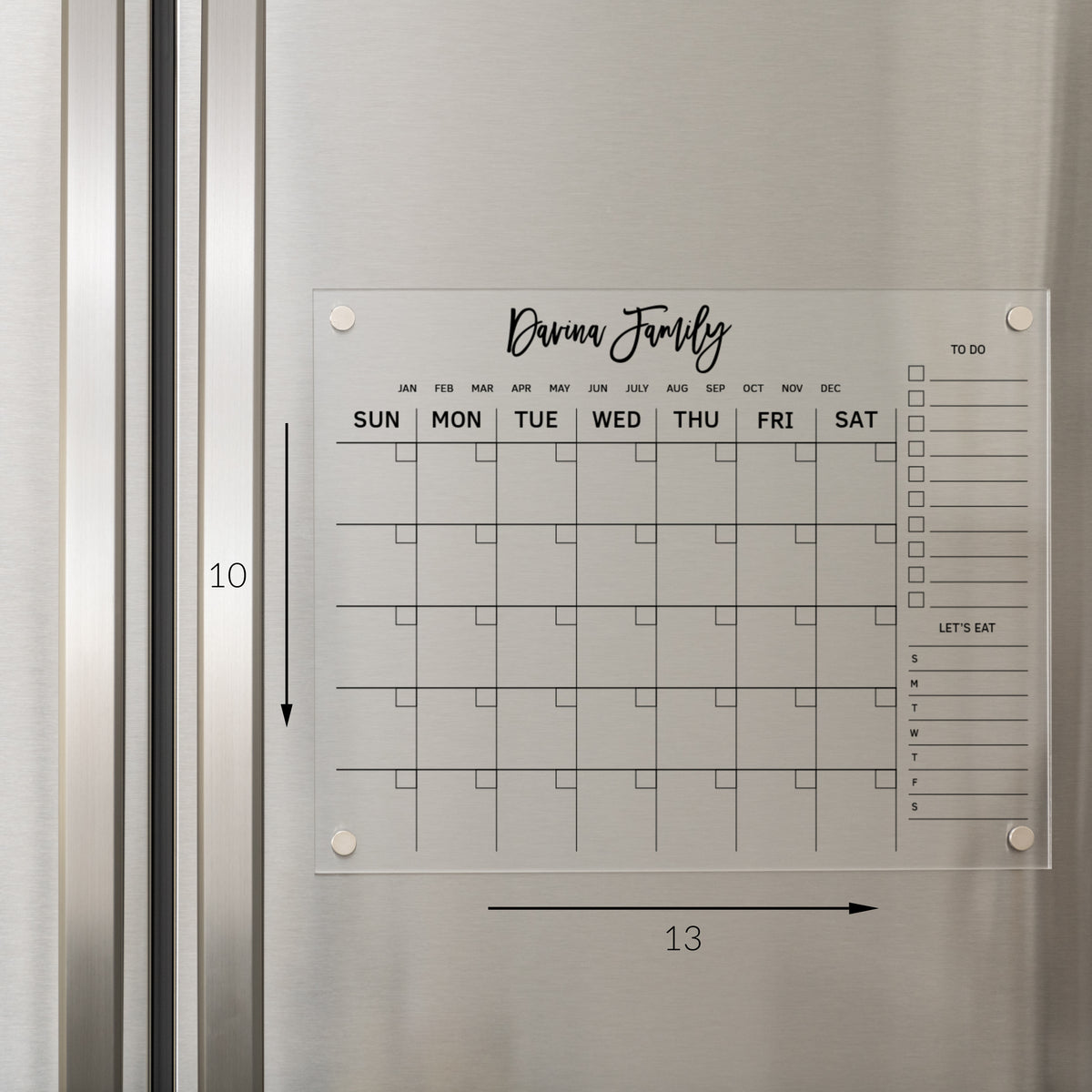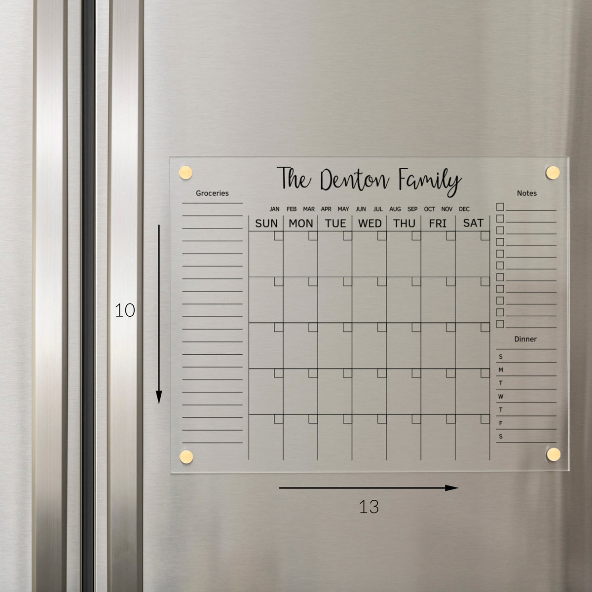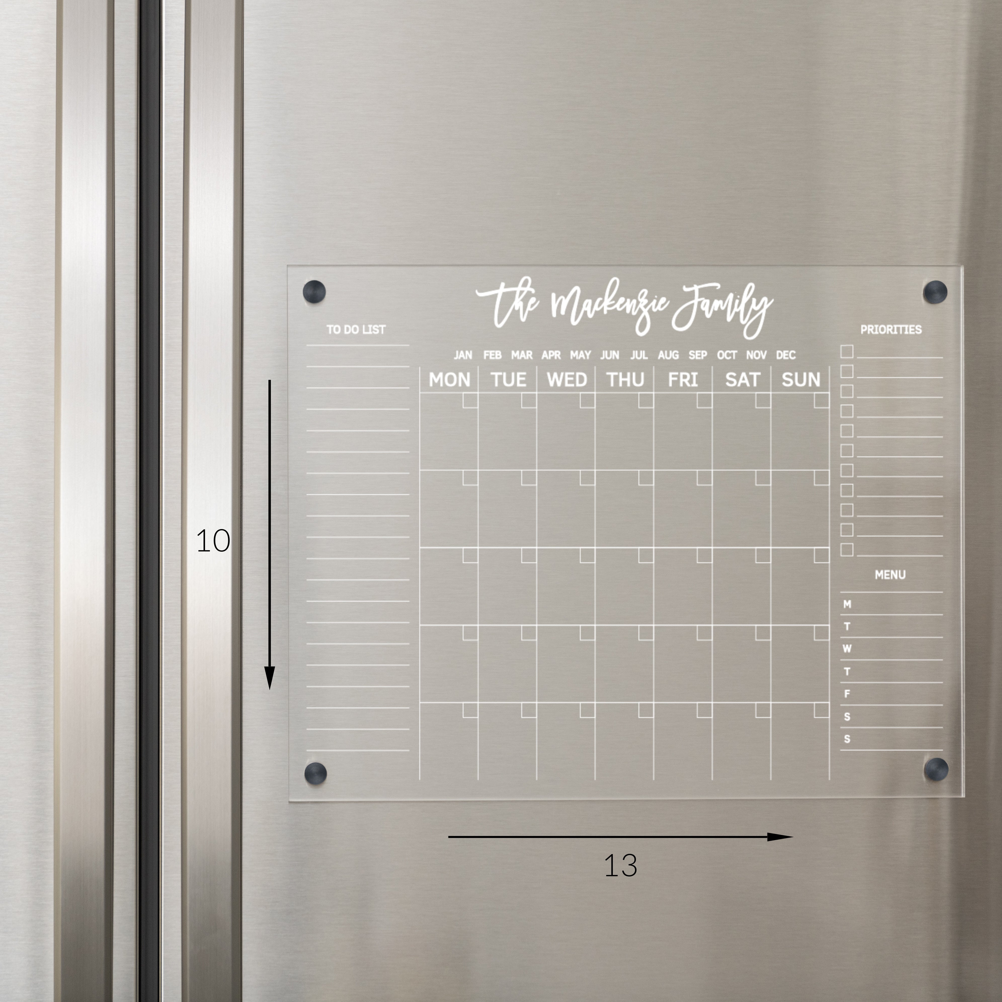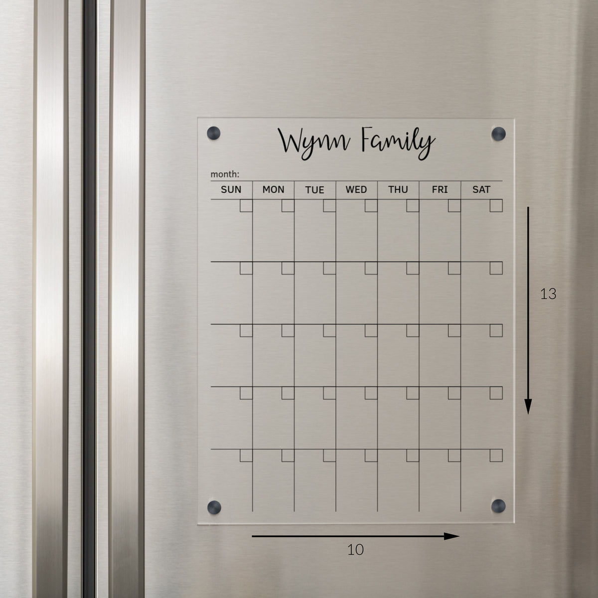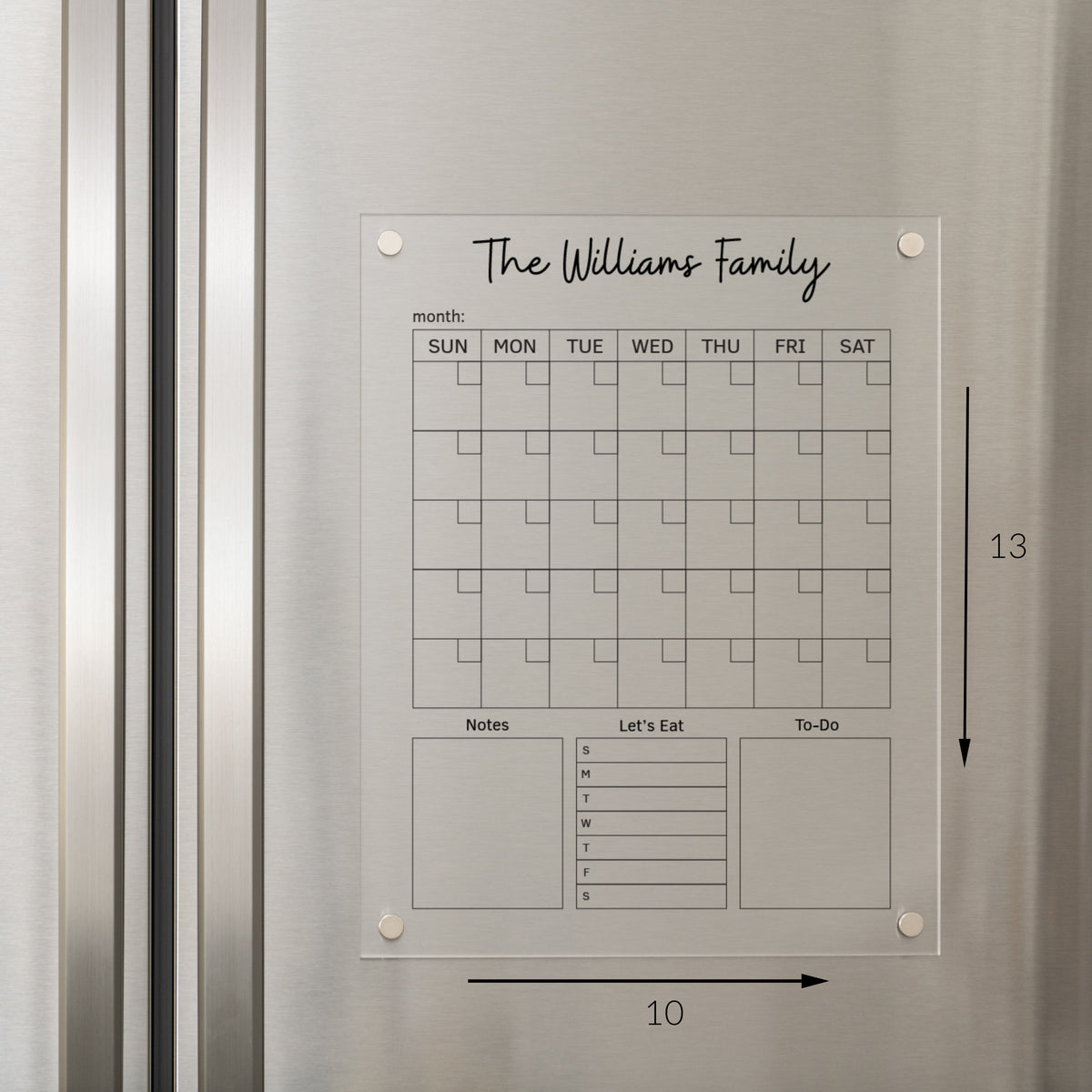 Keep track of birthdays, events, practices, appointments and more with this acrylic calendar. Stay organized all month long with daily boxes and up to three custom sections, such as menu, to do list, or notes.