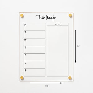 Stay organized the whole week long with a dry erase acrylic calendar. Perfect for offices or family command centers. Personalize section headers to meet your needs.