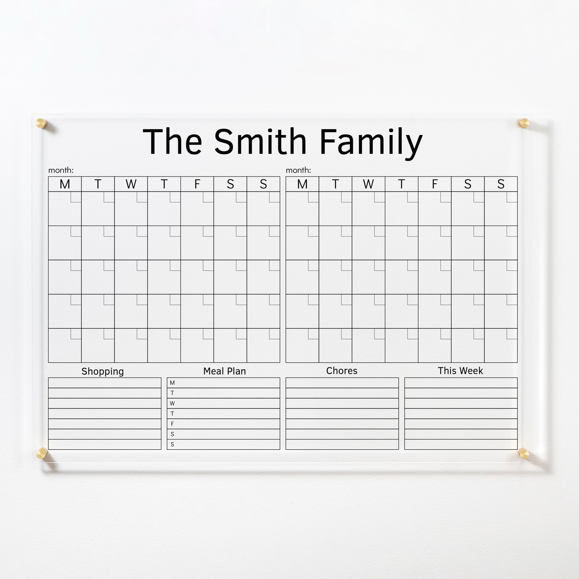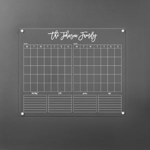 Stay organized this month and the next with the 2 month acrylic dry erase wall calendar. Personalize it with a quote, phrase or family name. The four bottom sections offer you enough space to add notes and to dos or any other title to help you stay on track. You can also choose a Sunday or Monday start date.